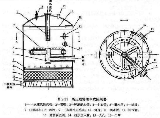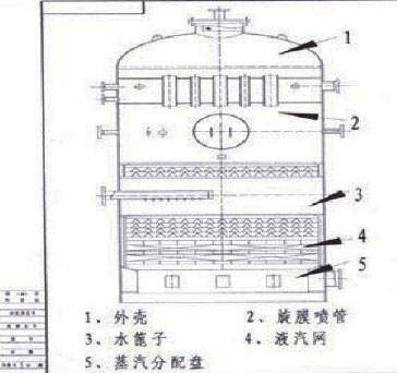 2、結(jié)構(gòu):殼體、水箱、除氧頭、進(jìn)水管、進(jìn)汽管、旋膜管、淋水篦子、填料、再沸騰管、防旋板、儀表。