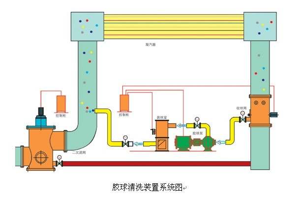 連云港神美電力輔機(jī)有限公司生產(chǎn)的凝汽器膠球清洗裝置,適用于50~600MW汽輪機(jī)發(fā)電機(jī)組,膠球清洗裝置主要由膠球泵、收球網(wǎng)、裝球室、電控柜以及附屬件等設(shè)備組成。 其工作原理是:膠球泵啟動(dòng),借助水流的作用將直徑大于冷凝管內(nèi)徑的海綿膠球擠進(jìn)凝汽器冷凝管,經(jīng)收球網(wǎng)收球再進(jìn)入裝球室。通過(guò)這一過(guò)程,膠球?qū)淠苓M(jìn)行清洗,維持冷凝管內(nèi)壁清潔,保證凝汽器設(shè)計(jì)換熱效率不下降,從而維持凝汽器的端差和汽輪機(jī)背壓;同時(shí)避免冷凝管內(nèi)壁腐蝕,改善運(yùn)行條件,延長(zhǎng)機(jī)組壽命。 下面是膠球清洗裝置系統(tǒng)圖: